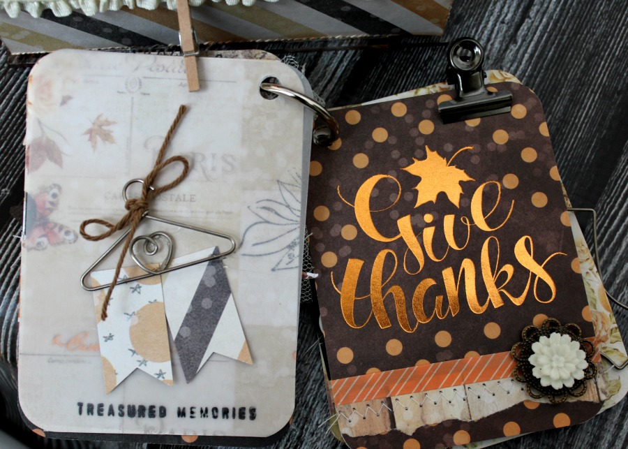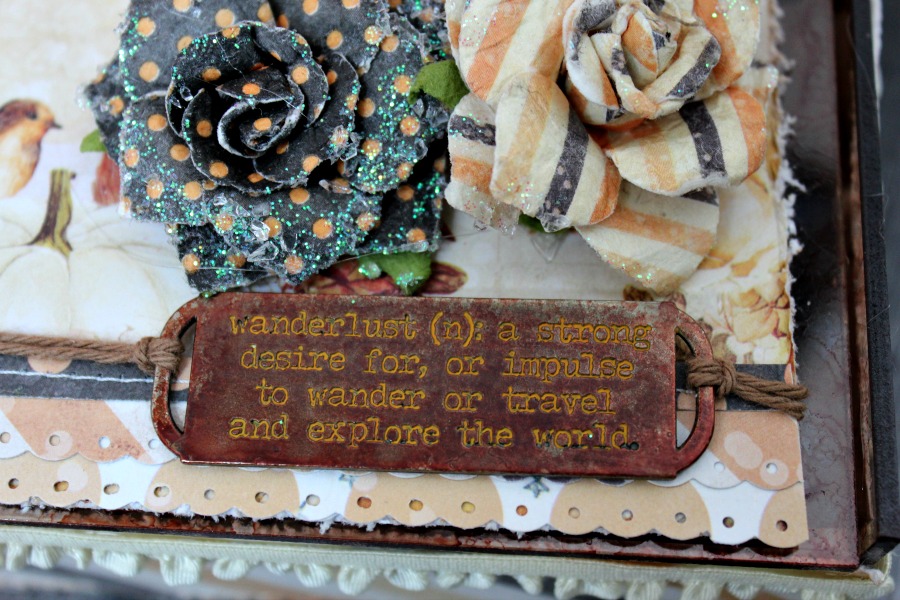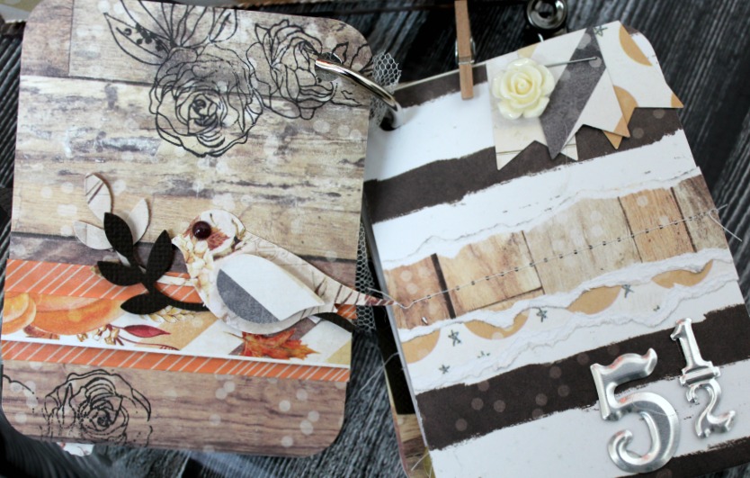 Additional products used: patterned paper, paper flowers: Prima; metal embellishments: Maya Road, Tim Holtz, Cocoa Vanilla Studio, Freckled Fawn; punches: EK Success, Fiskars, Stampin Up; bakers twine: The Twinery; ribbon, decorative pins: Maya Road; washi tape: American Crafts; stamp: Heidi Swapp, American Crafts; ink: Ranger; adhesive: Beacon, Thermoweb; misc: thread, sewing machine, book ring, buttons.
