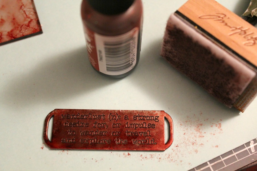 You can also use alcohol ink on metal embellishments such as this one. After dry, I applied Distress Paint in Mustard Seed and wiped with a paper towel to color the words.
