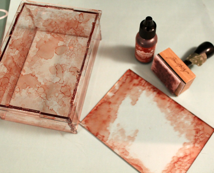 I colored my acrylic pieces with Ranger Alcohol Ink in Rust to match my paper.