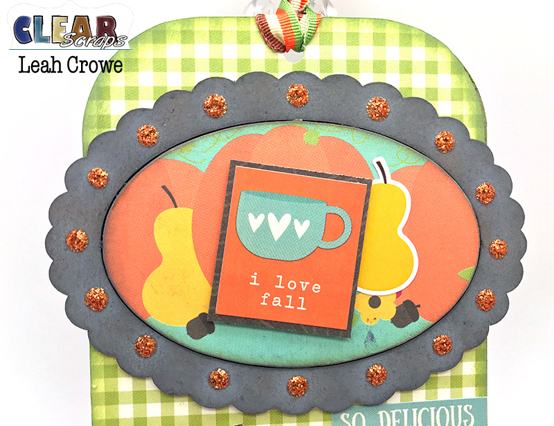 On this tag, I added the small oval scallop frame. I painted the scallop edge using distress ink, then added stickles around the edge, For the inside of the frame, I adhered some pumpkins from a journaling label.