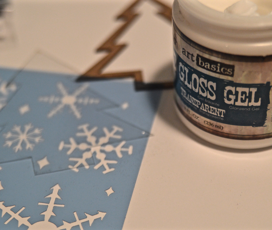 I began with the acrylic window, so it had ample time to dry, I used the 6" Nordic Snowflake Mascil/Stencil and Art Gloss Gel to create the snowflakes on the cover, after removing the protective film.
