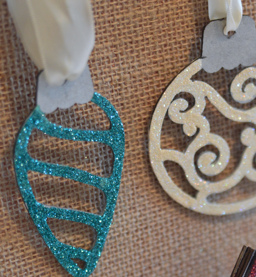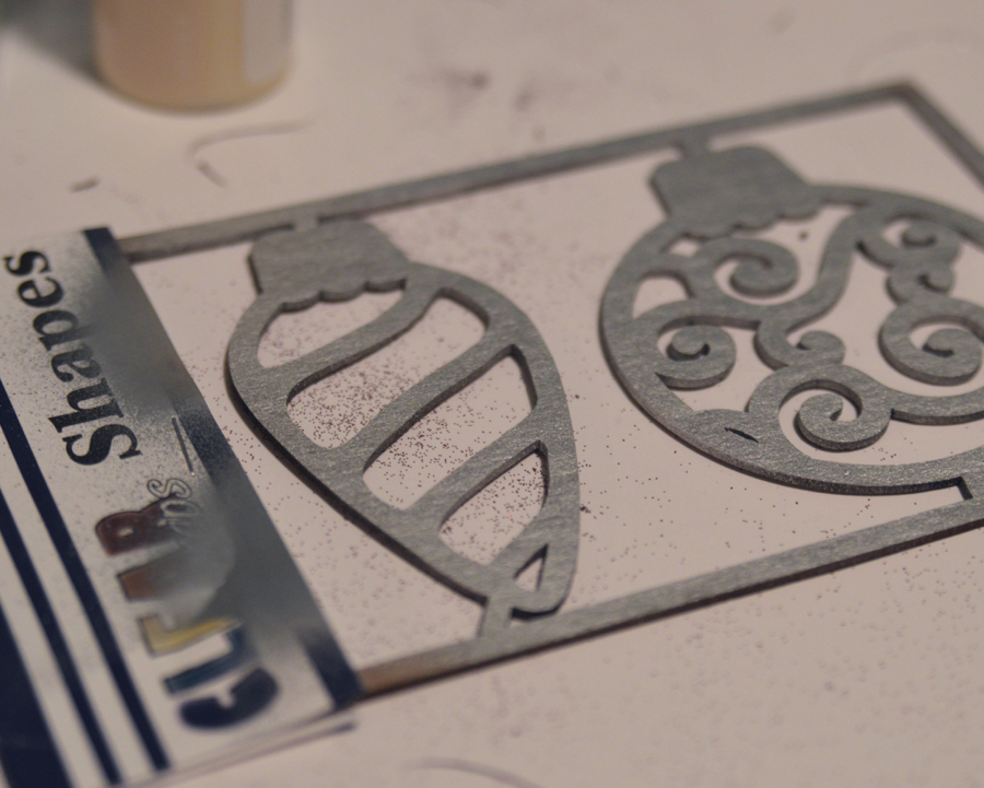 I used the X-masSwirl Bulbs Chipboard Embellishments. Since they are two sided, I spray painted both side in a silver spray paint (Krylon).