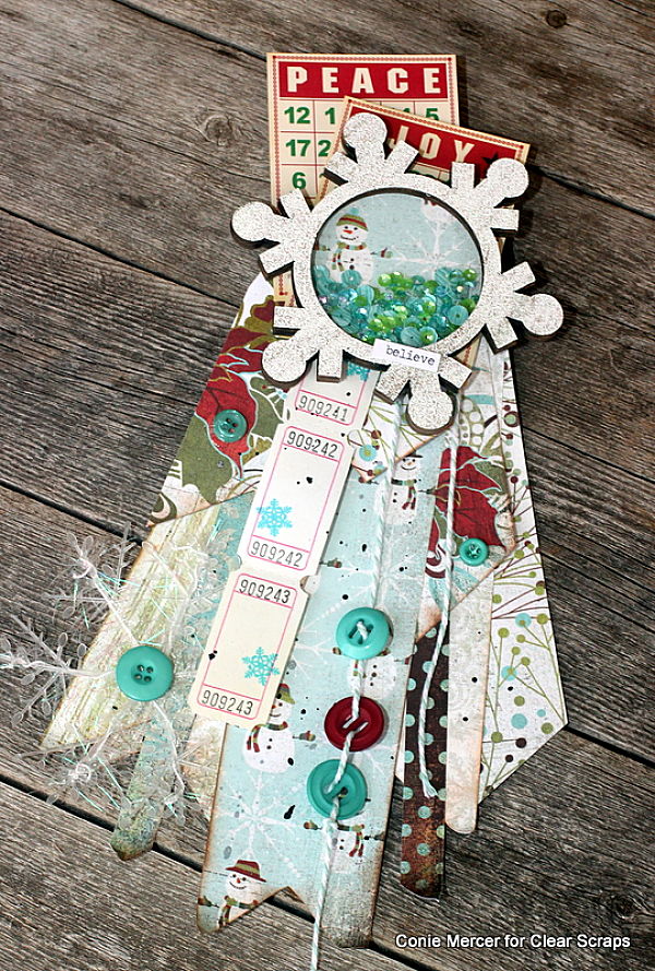 Take strips of pattern paper and layer them, making an award badge. Ribbons, buttons, ticket strips all can be used to make the badge unique and personal. Place the Snowflake Shaker by Clear Scraps, at the top (after it is created) and attach with strong glue.