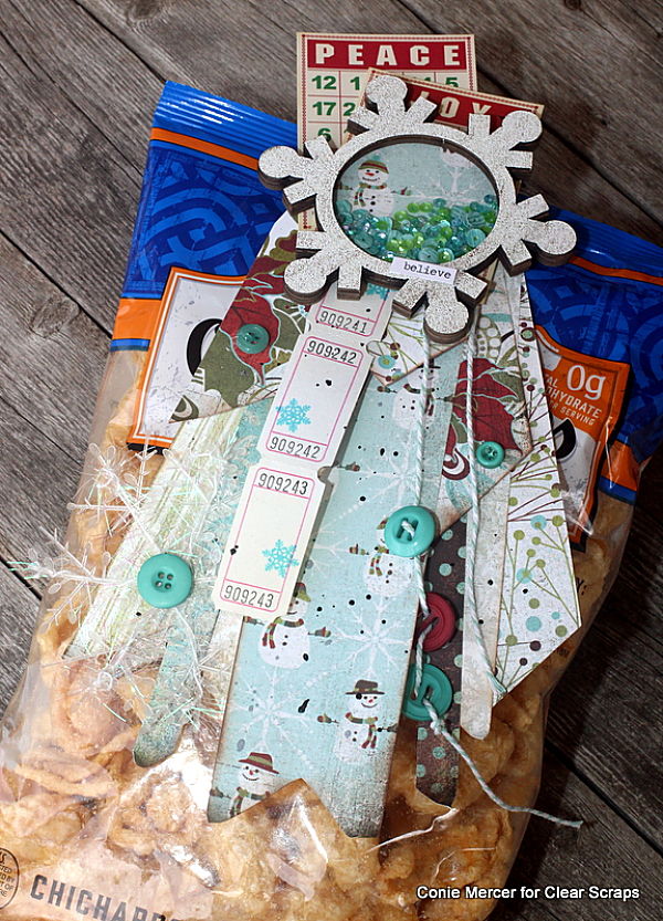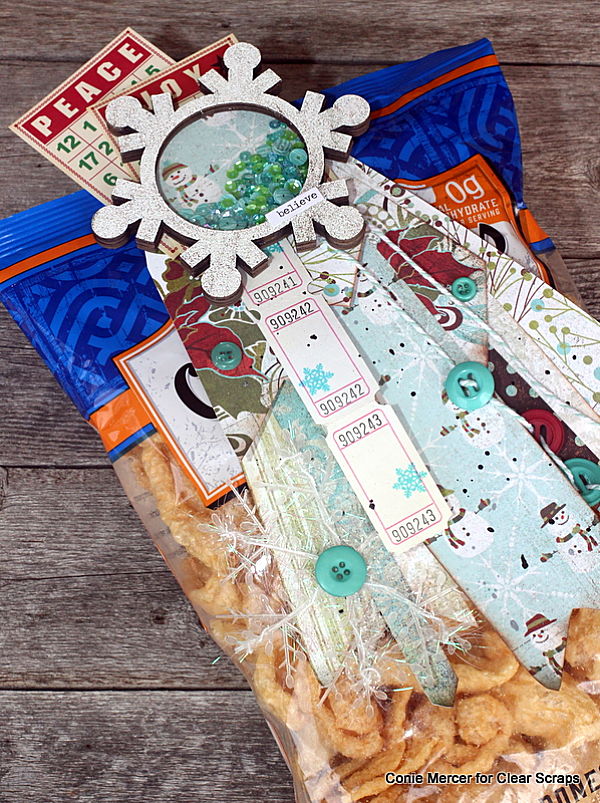 Hi, Connie here to share with you a fun idea when taking chips or bagged treats to a party or to give as a gift. The Snowflake Shaker by Clear Scraps comes in handy when creating a bag clip for yummy holiday treats!! Homemade or purchased this will look so cute on the bags!!