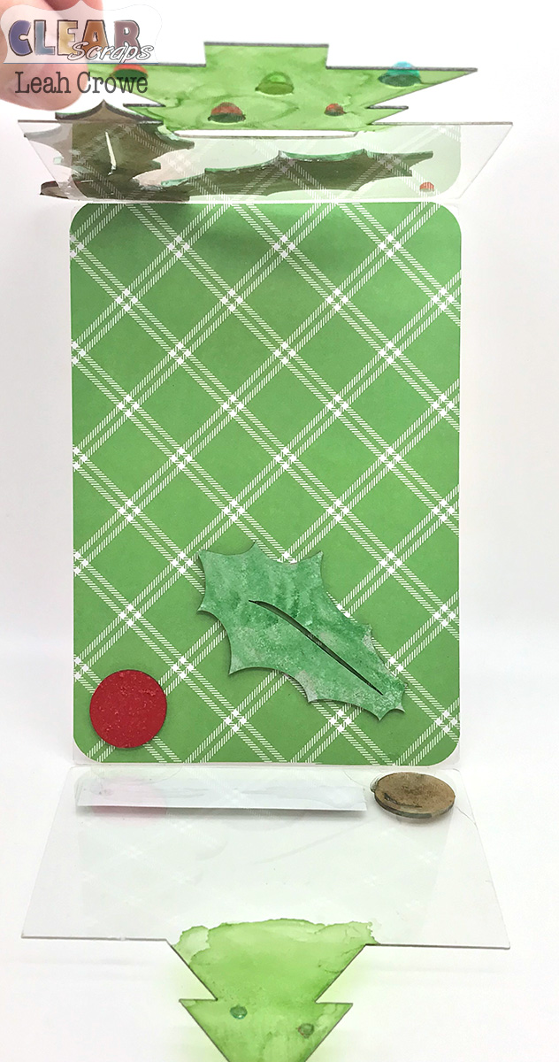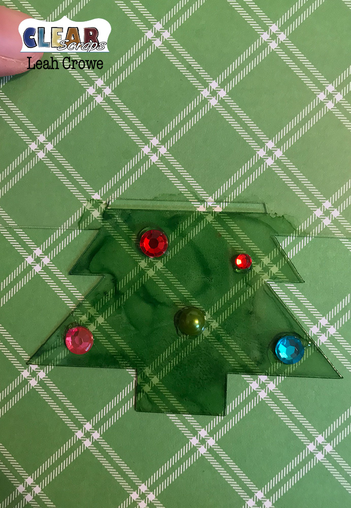 The way this card goes together, the tree locks together to hold the card front closed. I colored the top and bottom of the tree using Alcohol Ink in Meadow. I then added in small gems to act as ornaments.