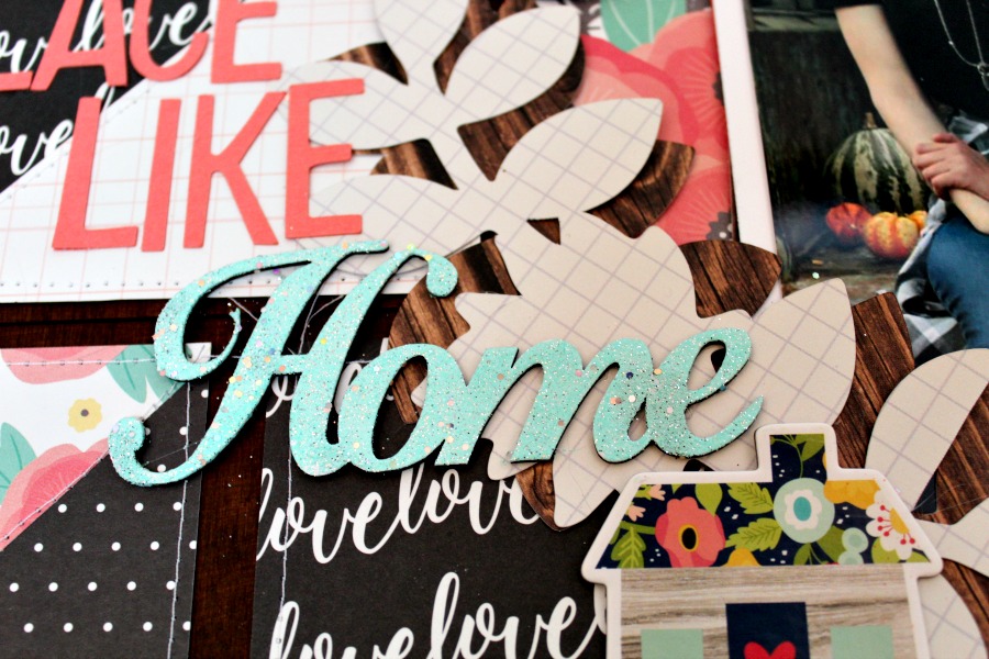 As a part of my title, I used the new Home Chipboard Word Title which I colored with glitter embossing powder! I thought it went perfect with the House DIY Pallet Shape as well as the saying I used (I'm a big Wizard of Oz fan)!