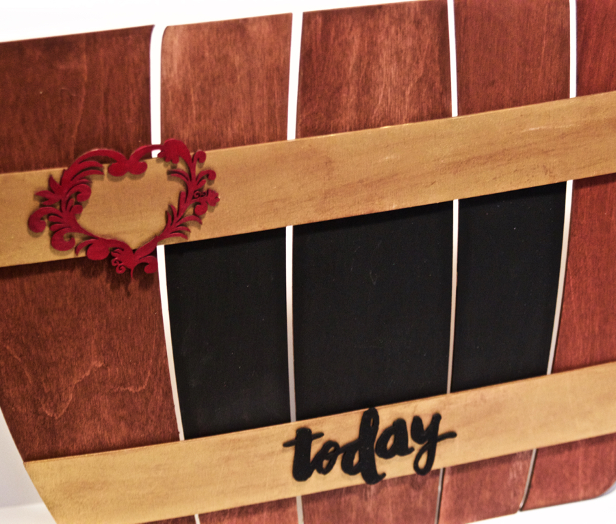 For this whiskey barrel I took some acrylic paint mixed with water to "Stain" the wood and bring out the woodgrain. It worked really well. Now for the chalkboard area, I used Chalk Paint but i highly recommend you paint 3/4 coats because wood is porous naturally and it will absorb a bit. But once you get it painted, you are good to go! Also did you notice the Chipboard Heart Shape? That is the Flourish Heart Chipboard Embellishments, love those embellishments for many many projects!
