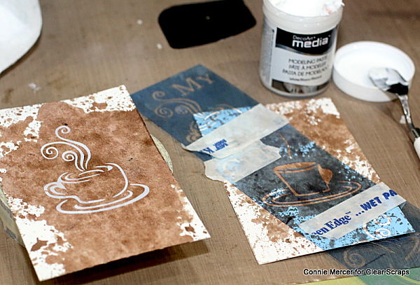 To create the background for the cards, S.E.I. Tumble Dye was sprayed on watercolor paper. Any spray paint, mist product will work to make a space for the coffee cup to be stenciled in the middle using modeling paste.