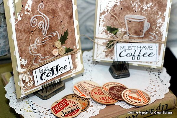 Hi, Connie here with a couple of coffee cards using the Cup Overflow Border stencil by Clear Scraps. The 6" Holly stencil was used also but could easily be switched out for a Spring time leaf.