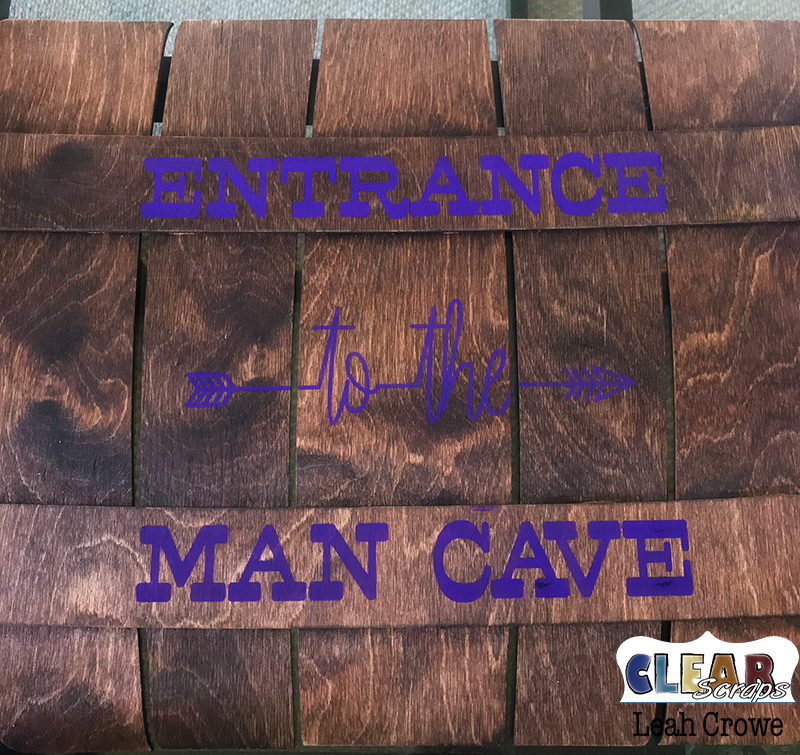 I knew my husband would love an entrance to his new man cave in the garage, he's currently in the process of setting it up now. So I used a my cameo silhouette to cut out this stencil, which I applied to the whiskey palette. I painted on the stencil very lightly. I should have painted twice because of the purple (hubs favorite color) and because of the stain color is so dark.