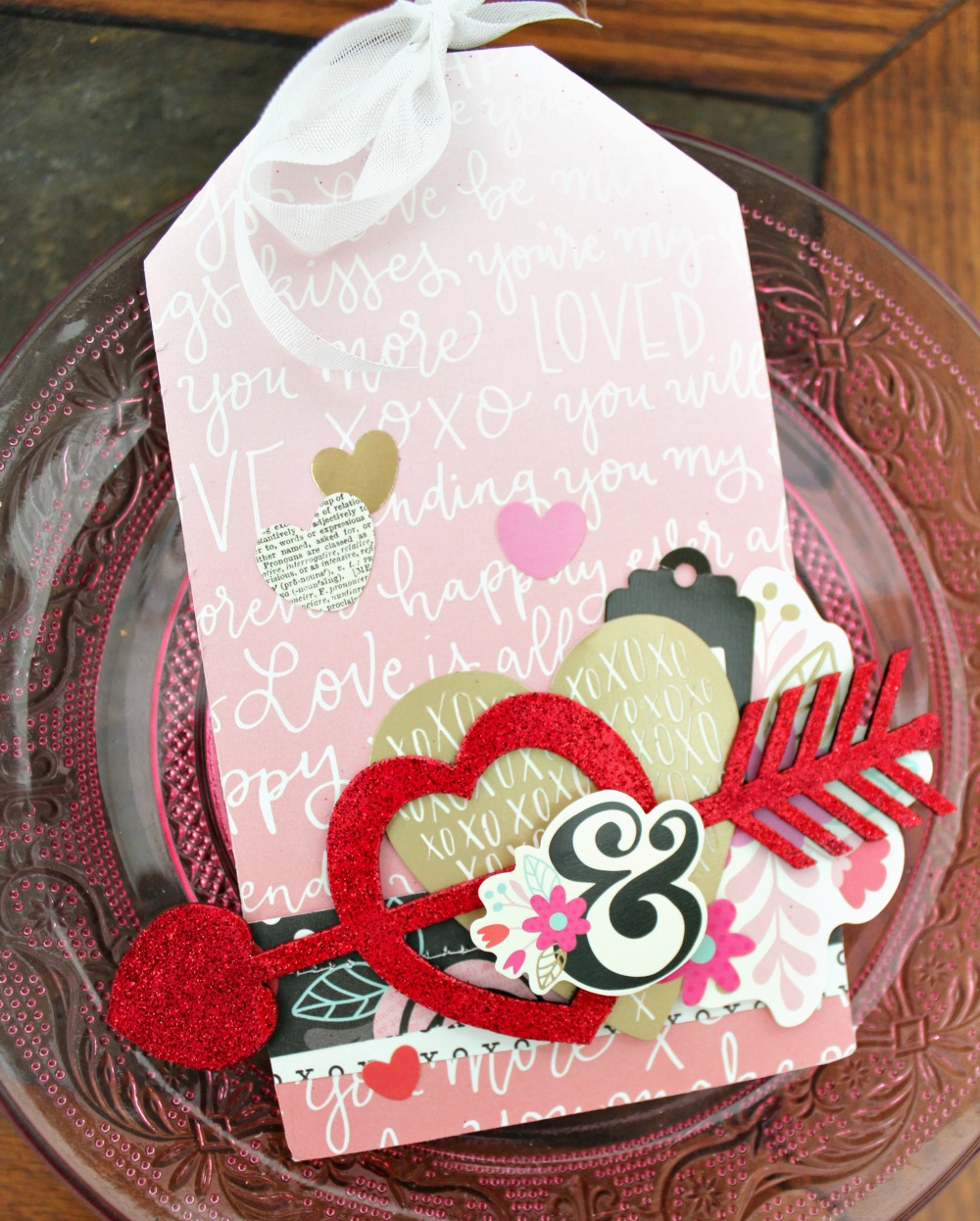 Once dry, attach to the front of your tag! I layered more patterned papers and some die cuts underneath my Arrow Heart Chipboard Embellishment. Using a pop dot, I adhered a cute ampersand to the right center of the heart. What can I say…I love layers! My finishing touch is adding a ribbon to the top of the tag!