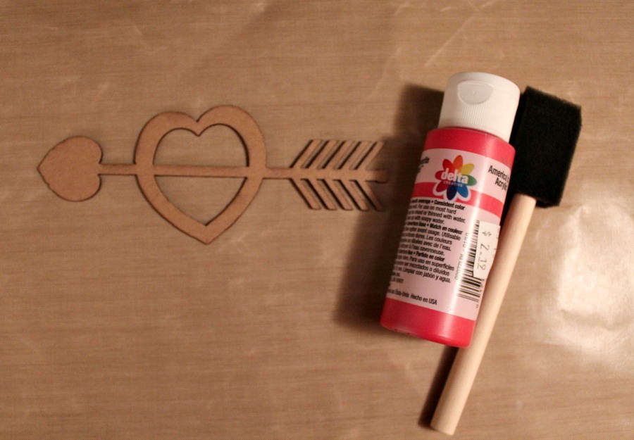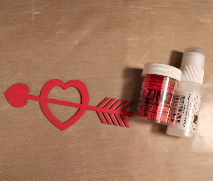 I set aside my tag to color my Arrow Heart Chipboard Embellishment. I always like to start with acrylic paint to cover the chipboard. Today, I used a Cardinal Red. You will have to apply at least two coats to get good coverage.