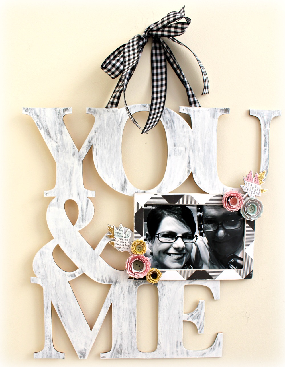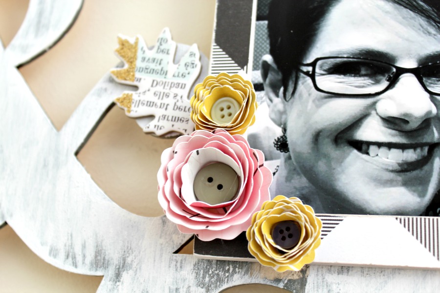 I covered the frame portion in a black buffalo plaid print and adhered with my Beacon 3-in-1 Adhesive. I used a cut file from the Silhouette shop to create these rolled flowers with different patterned papers. (Paige Evans "Rolled Flower" cut file #237217). I inserted buttons from my stash into the centers of the flowers, as well.