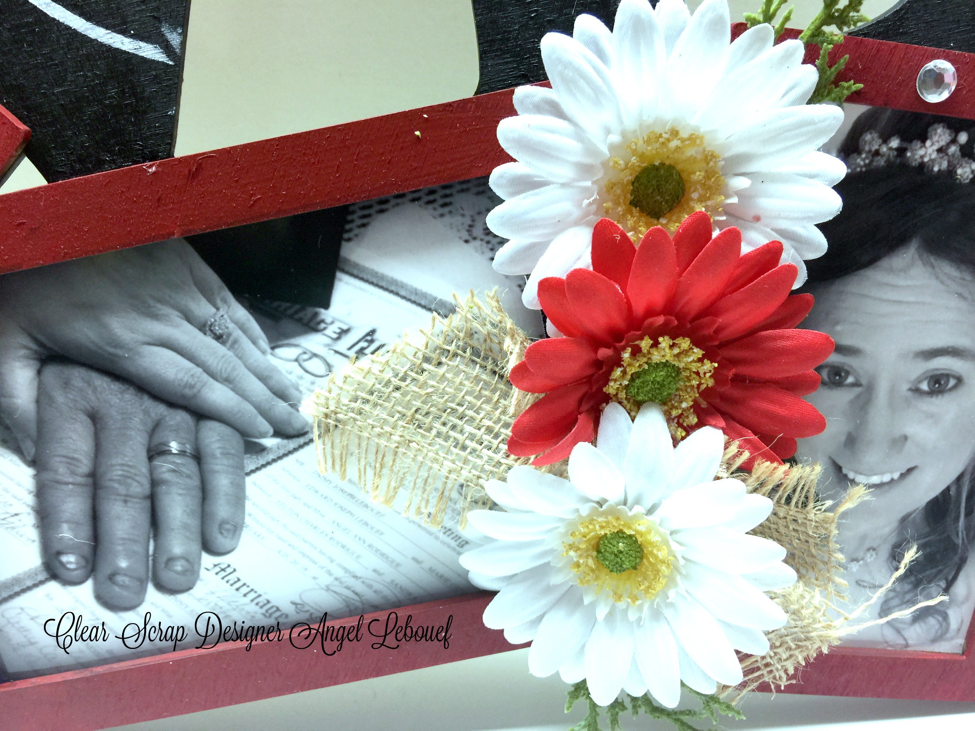 I have painted the wooden frame with black and red acrylic paint.Added photos from our wedding and adhered the top red frame piece to the main black piece.