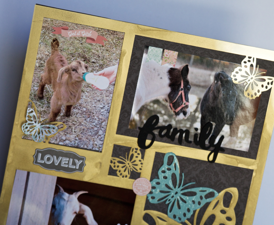 For this page I removed the protective film from the back of the Mono Butterflies 12X12 Acrylic Layout, then I spray painted it in metallic gold. After it dried I adhere it to a page from the Creating Made Easy February 2018 Main Kit (which is fabulous by the way) and started inserting photos from a farm day I had with my boys.
