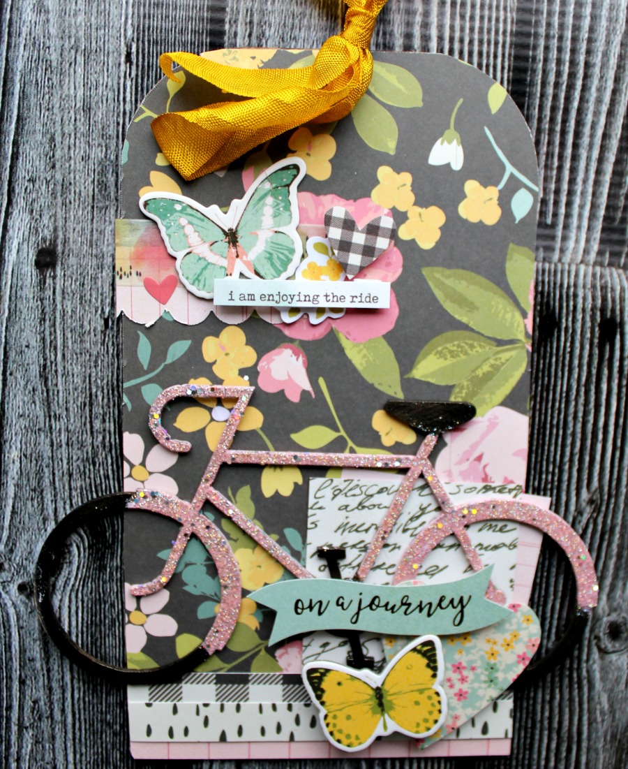 I finished embellishing my tag by adding die cuts, stickers, and chipboard pieces from the collection I used. I then took a piece of white seam binding and colored it yellow with Distress Stain. Once dry, I tied it at the top of the tag!