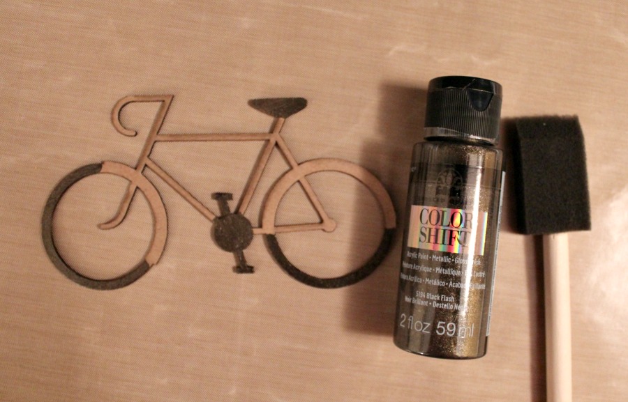 I found this Color Shift metallic paint from Plaid in black and thought it would be perfect for the tires, pedals, and seat of the bike!