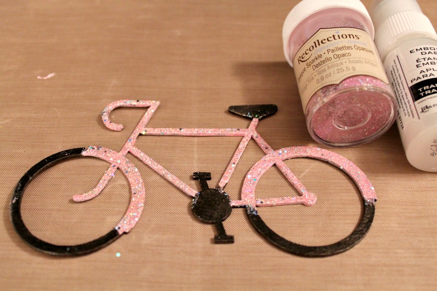 Once my paint was dry, I applied embossing ink to the pink areas of the bike followed by a glitter pink embossing powder. Next, I set the powder using my heat gun.