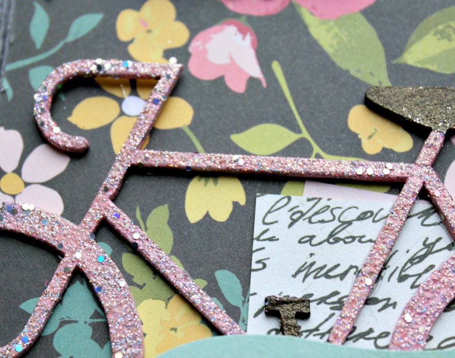 Additional products used: patterned paper, chipboard, stickers, die cuts, washi tape: Simple Stories; adhesive: Beacon, 3M; ribbon: Snug Hug; paint: Plaid; embossing ink, distress stain: Ranger; embossing powder: Recollections; punch: Fiskars.