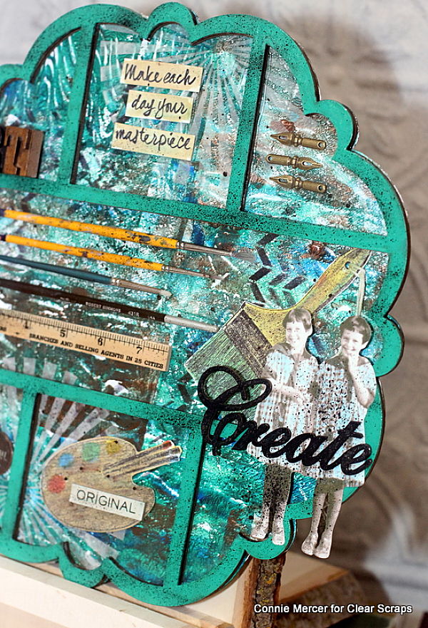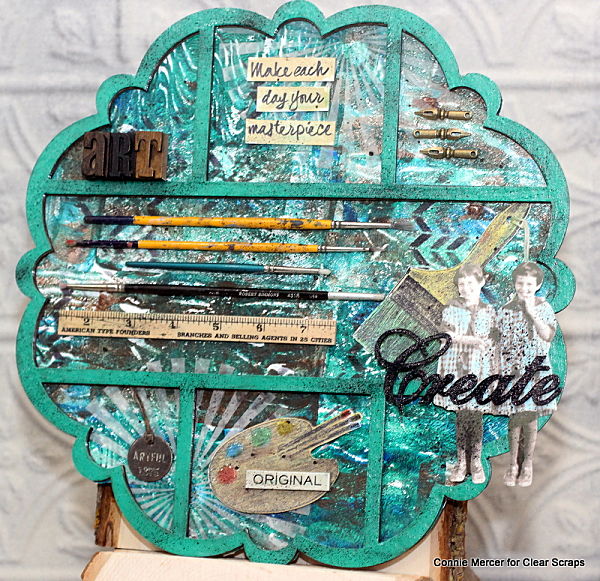 Hi, Connie here with the Scallop Circle Printer Tray with a creative twist. Clear Scraps makes this very cool product that you can really get creative with. I really wanted to take it up a notch with more of a vintage look. Instead of adding sequins, buttons and making it a shaker with photos I created a shadow box. Once I got going on this more ideas flooded my head. This is how it all shook out ~