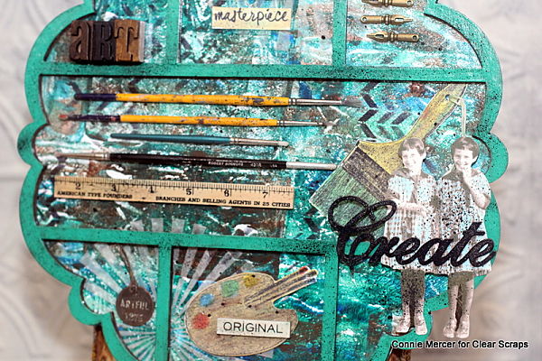 Apply a stencil design and add modeling paste for a raised texture. Dry with heat tool. For added texture apply more stencils with ink. Gather and prepare items for inside the Printer Tray. I stamped out some Art themed stamps, trimmed them out to add to the Printer Tray along with some other Art related items. Glue the items in the divided spaces and let dry. Glue two frames together and let dry (no need to paint the tops). Glue them to the bottom back panel. Remove plastic film from acrylic sheet and glue on top of Printer Tray. Prepare the top frame (paint or paper) and glue over acrylic sheet. Decorate front with more embellishments.