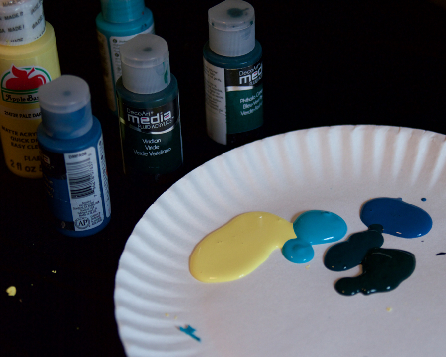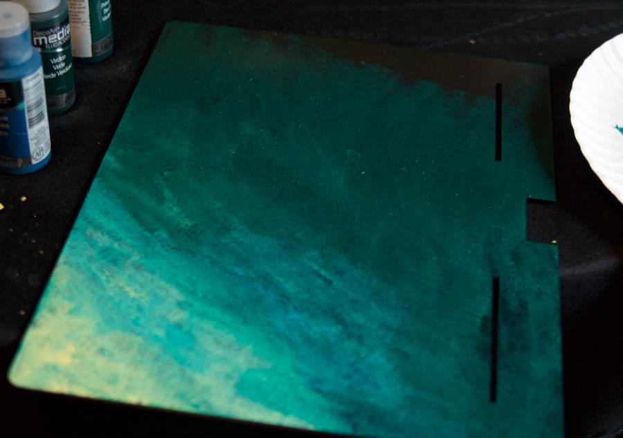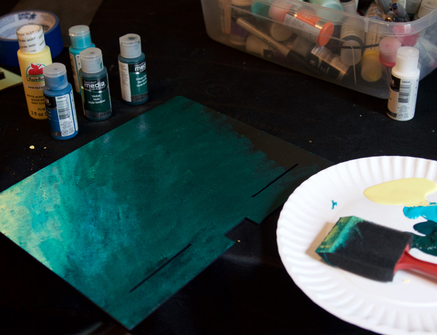 First I painted the Regular Tablet Stand with a black spray paint for the base, then I took a foam brush with a, acrylic yellow paint, and 4 different green blue acrylic paints in graduating colors.