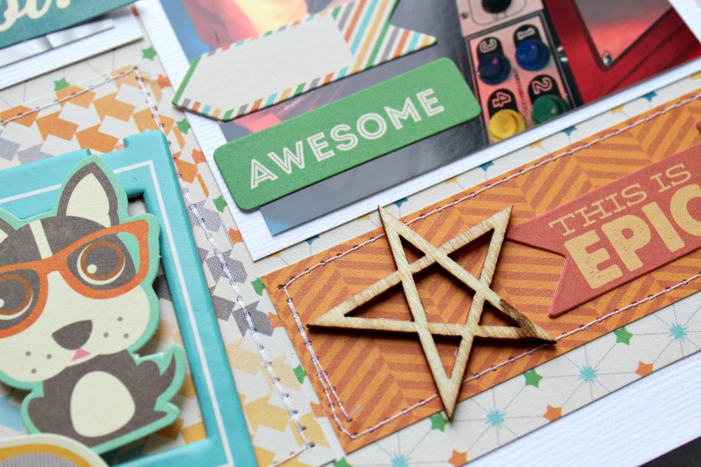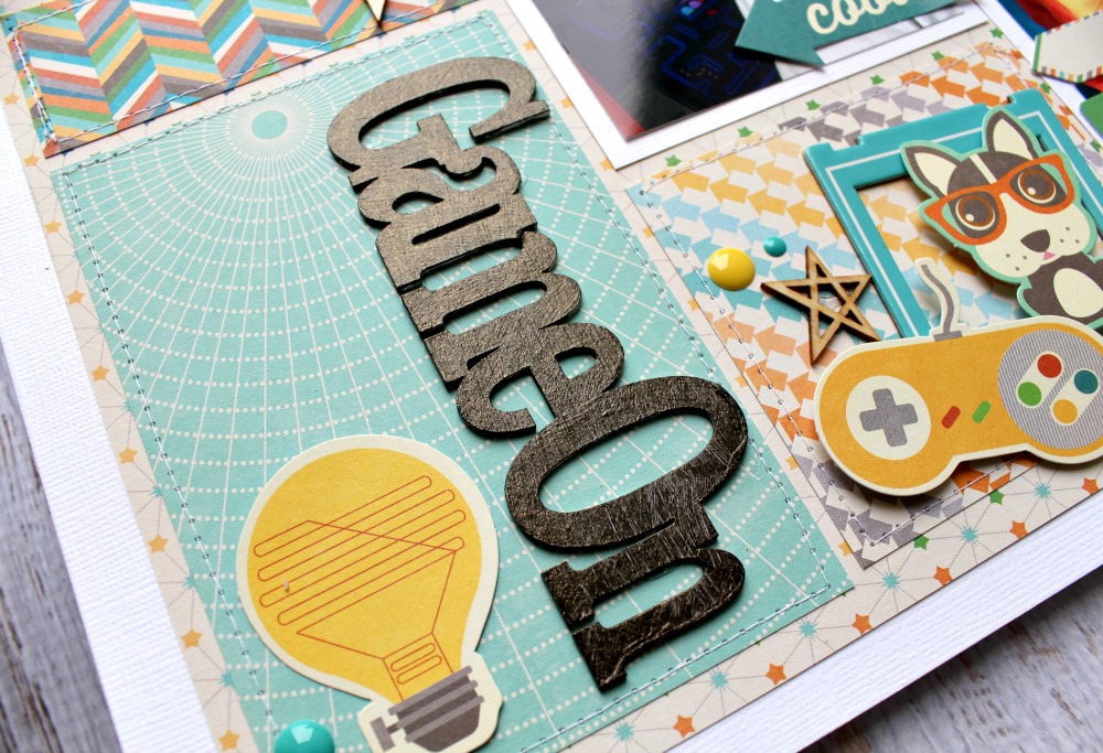 I did a grid style layout to fit in multiple photos as well as many patterned papers. I allowed my Game On Chipboard Word Title to be the focal point of the page with its contrasting color as well as vertical placement.