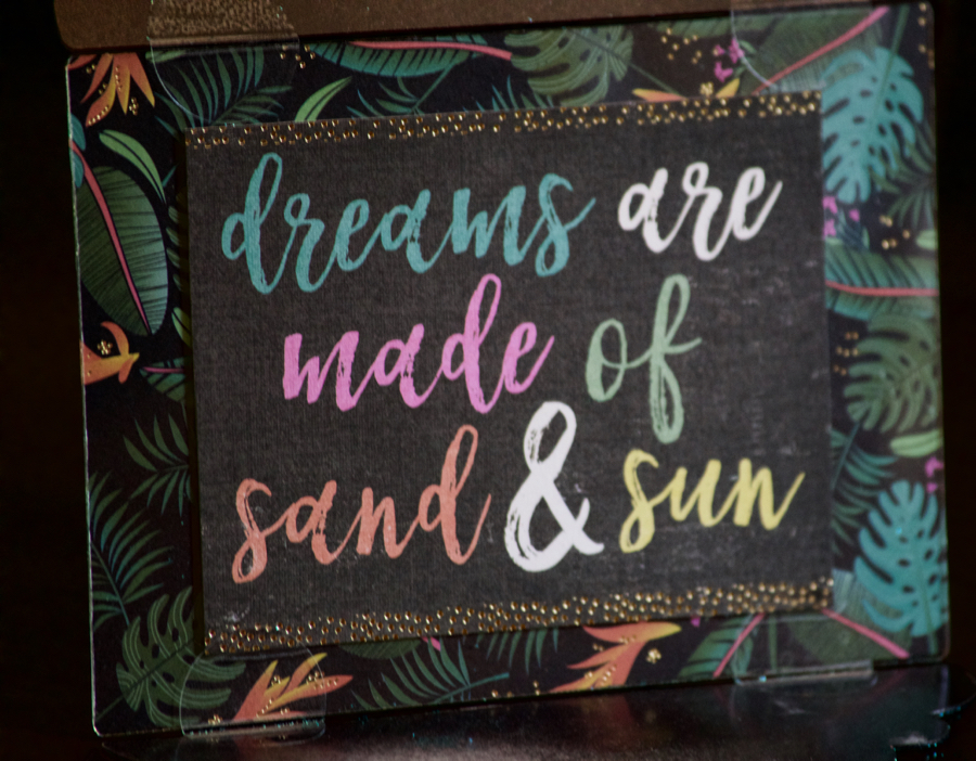 I used some tropical papers on the inside and I know you are wondering where in the world do I write in this card? Well I created a writing space on the back!
