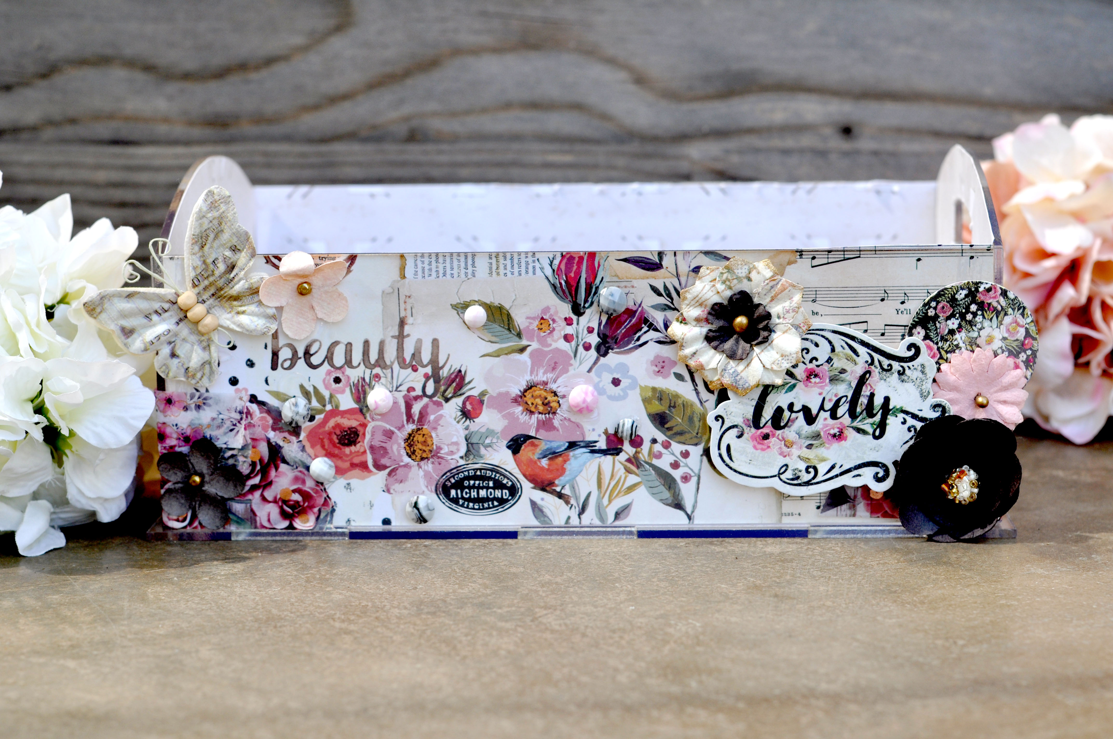 These little boxes are so quick and easy to make. I simply cover the inside of the acrylic with some favorite papers and then embellish to my hearts content.