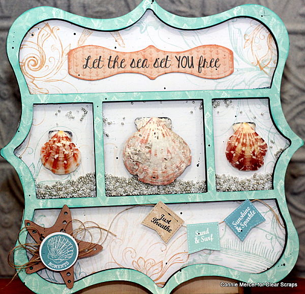 Hi, Connie here with the Deco Printer Tray Frame, by Clear Scraps, used to showcase a collection of scallop sea shells. I assembled this one a little different because I wanted the sea shells to stand out. Let me show you~
