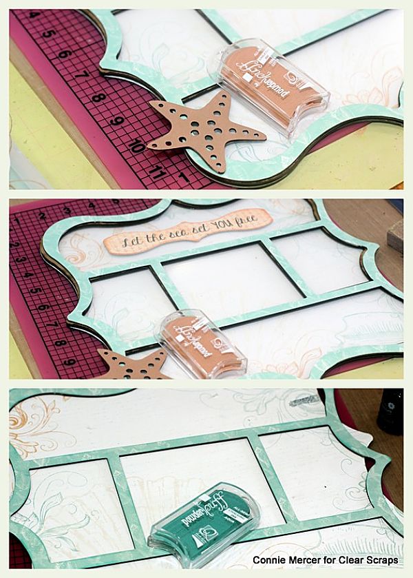 Add color to the chipboard star fish with ink or paint. Shade the frame with ink.
