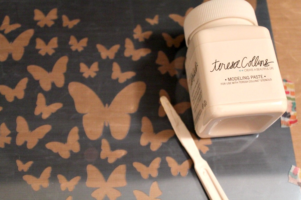 Next, I applied a generous coat of modeling paste to the Mascil. It does not matter if you apply your medium in one direction; just ensure you are covering all spaces. I also did not care so much about my paste being even as I wanted it to have dimension when dry. I allowed my modeling paste to dry overnight before coloring with my Distress Crayons. Scroll below for a video sharing this technique!