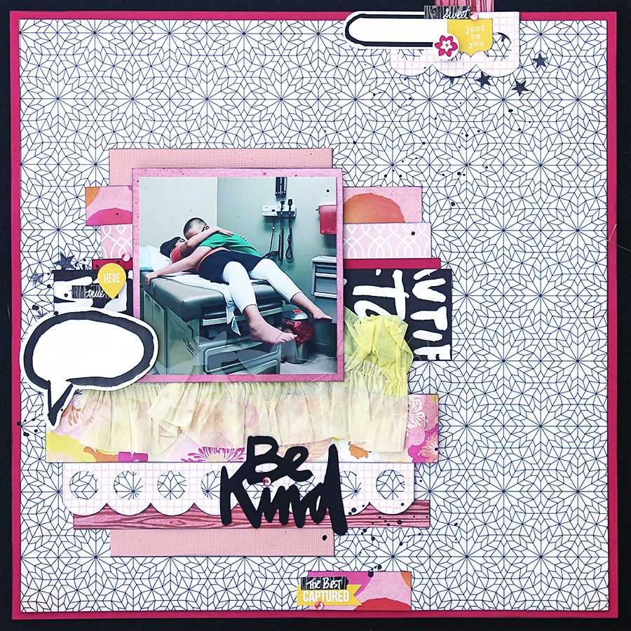 I used the Clear Scraps Acrylic Star border to add some interest to my layers of paper strips. It really makes you look twice to see the dimension and detail. I also inked some stars onto the background with the Clear Scraps 6 inch Star Stencil.
