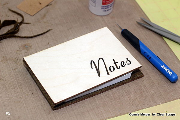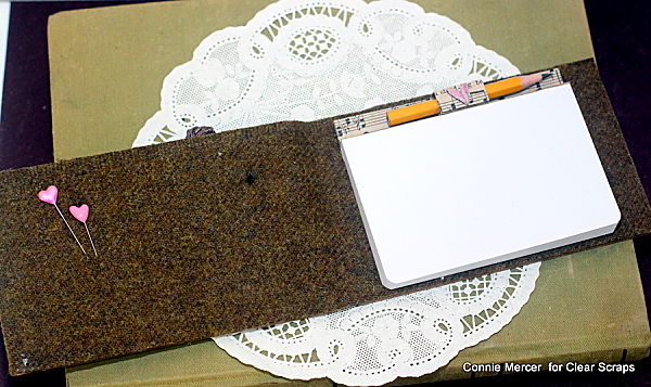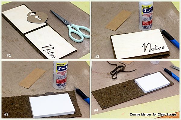 - Trim off excess felt with scissors. Cut a slit in the bottom, felt covered, birch wood piece. Use a cardboard guide, so the line is straight for the note pad to slide in. The note pad will need to have a cardboard lip, on the back, in order to do this method.