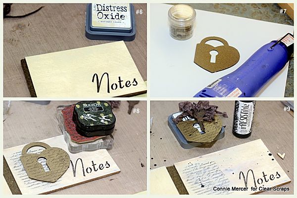 6. Emboss chipboard Hearts Lock and then stamp with Jet black StazOn ink using a script stamp.
