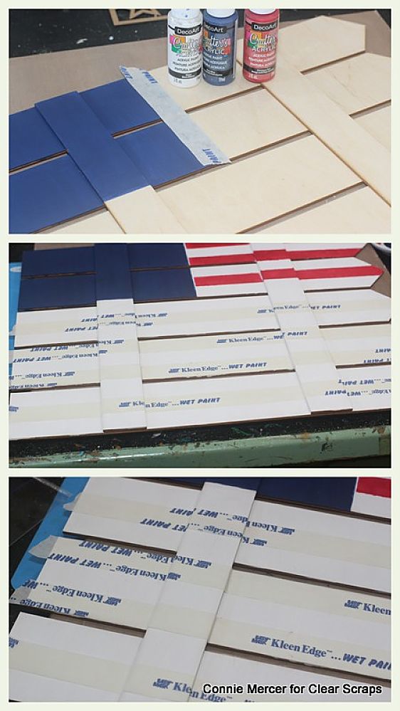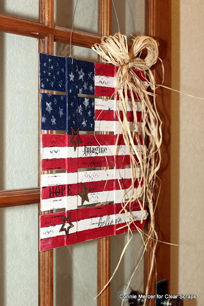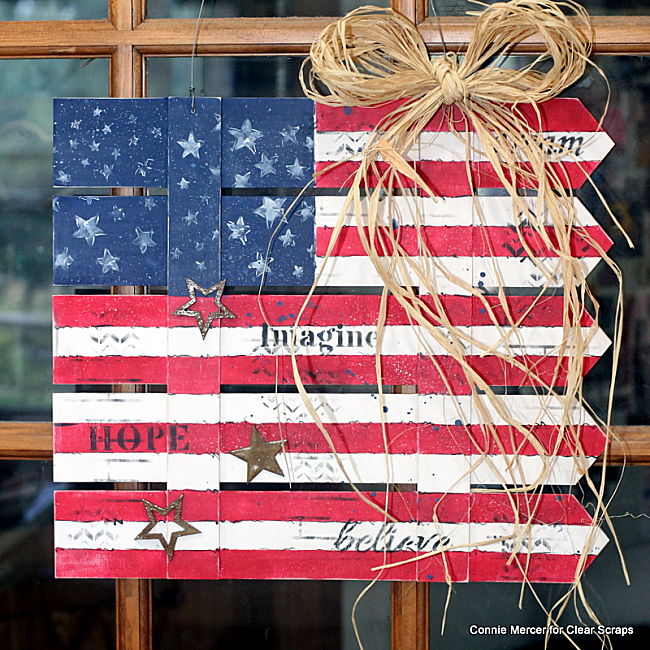 Hi, Connie here with a patriot craft that uses the Pallet (fence) shape by Clear Scraps. I turned it on its side and saw a flag, waving in the wind, so that is where I started. The Pallet shapes are cut from Birch wood right here in the good ole' USA. I favor American Made products and that is what Clear Scraps is ~ Made in America!!