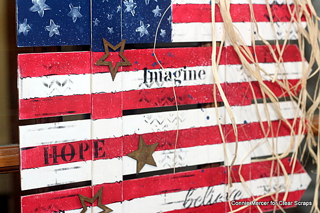 I used stencils by Clear Scraps to add the words, the chevrons, the ship lap and the stars to the flag.