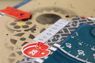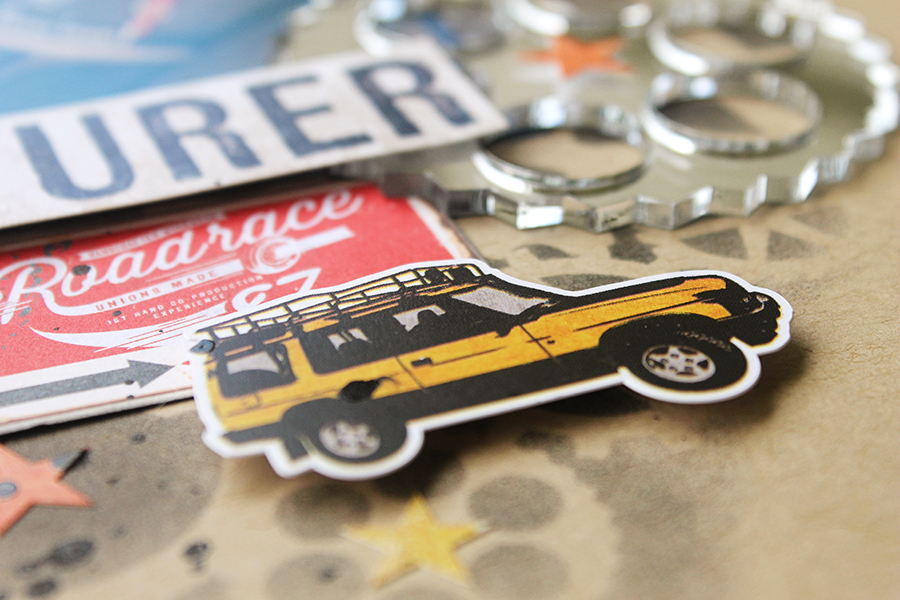 Here's a closer look at some of the stenciling and embellishment clusters. I know the little car embellishment isn't a van, but I'm not a crazy car person so it doesn't bother me.