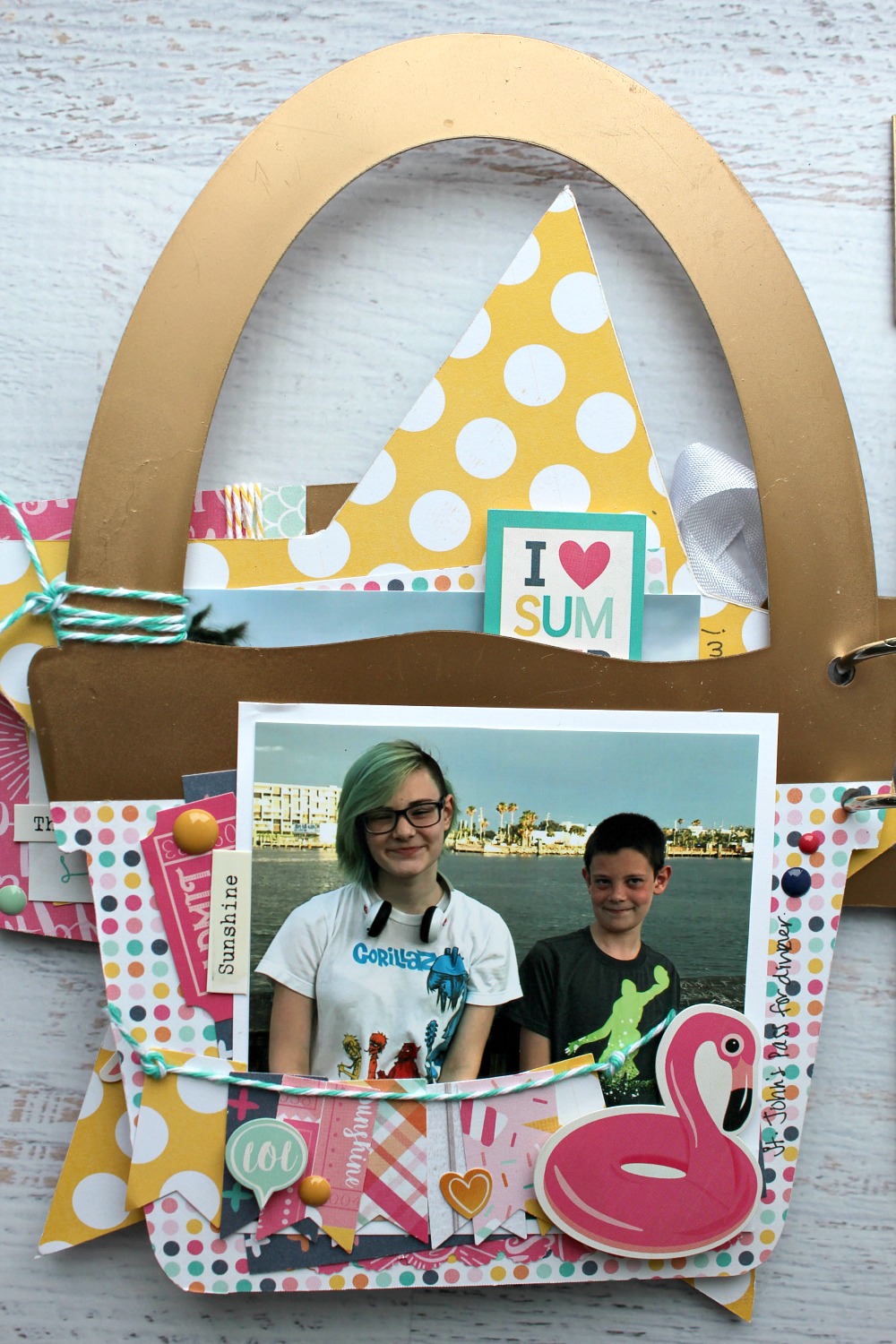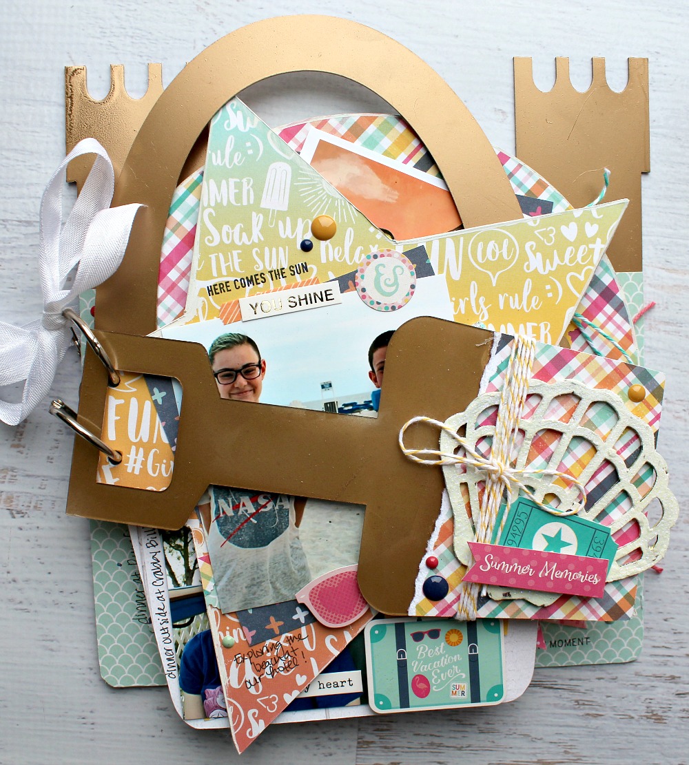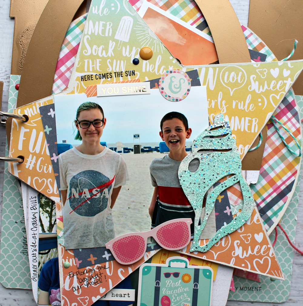 The last page is a fun acrylic sand castle which is the largest page of the book! The photo I wanted to use was vertical so I used the space to create a pinwheel with a favorite paper from the collection.