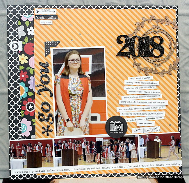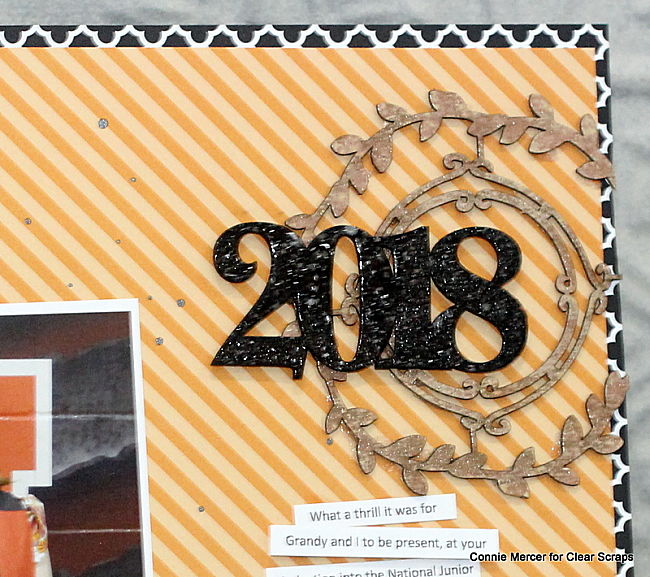 Hi, Connie here with a scrapbook page using chipboard shapes and the title year, as embellishments, by Clear Scraps. I love using chipboard on scrapbook pages! It is easy to make it what you need it to be. If you want to use paint, emboss it , ink it or leave it plain~ you can decide what look you like.