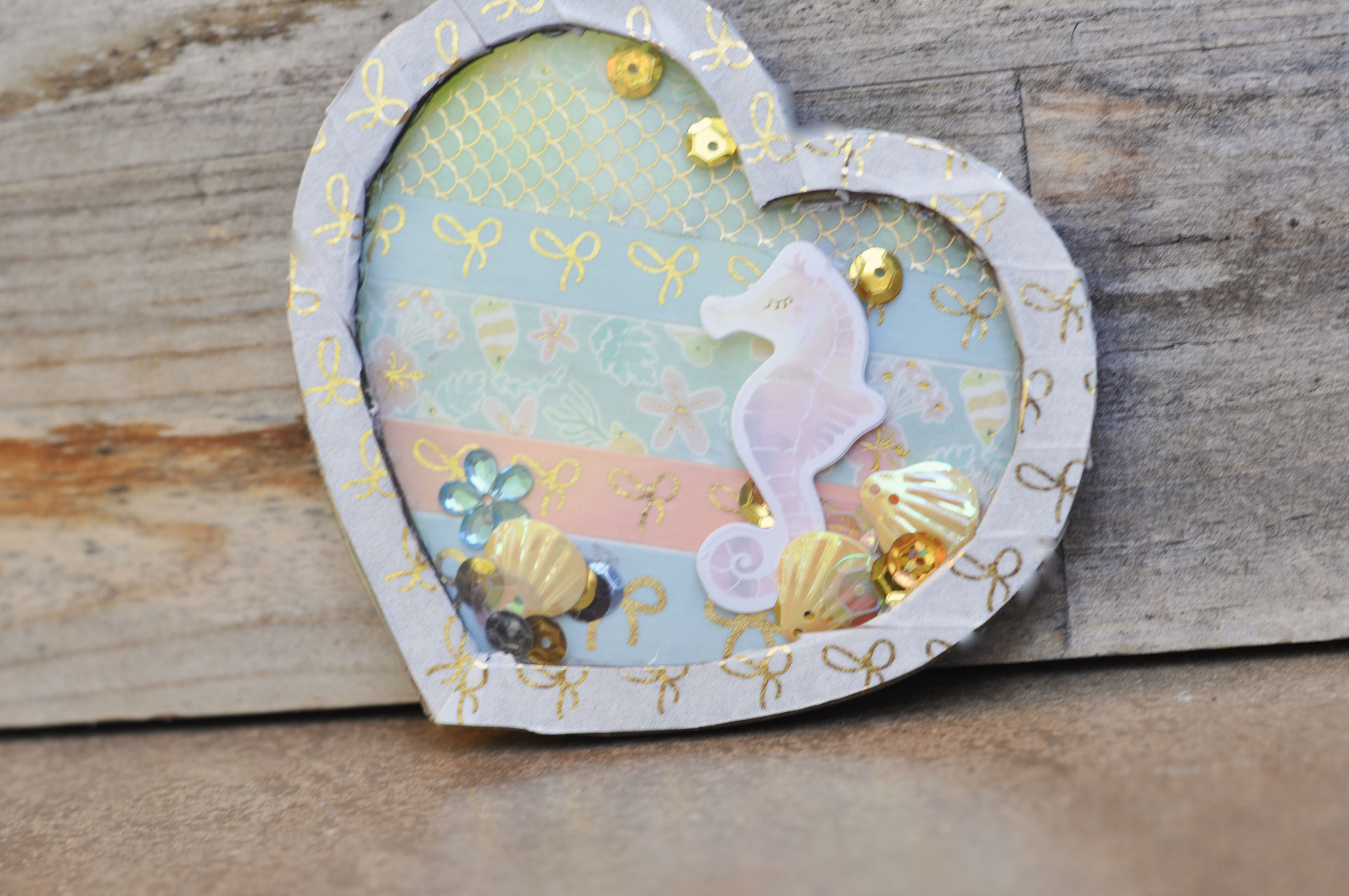 I began by covering the back piece of my shaker with strips of coordinating washi tape. Then filled my shaker with a die cut and some beachy sequins.