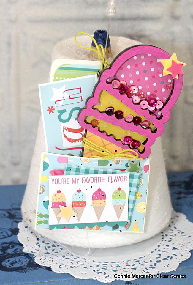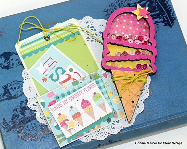 Hi, Connie here with a shaker project using the Ice Cream Shaker by Clear Scraps. An invitation for ice cream doesn't have to be fancy but it does need to be cute. So I statred there~looking for cute!!!