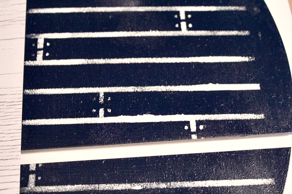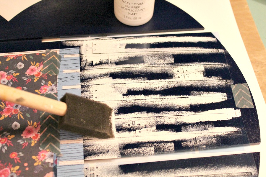 I also wanted to add some contrast to my background by using white chalk paint and the 6 Inch Shiplap Mascil. Using a foam applicator, I lightly dabbed my paint onto the pallet not worrying about clean lines. My goal was to have some areas appear lighter vs. the rest.