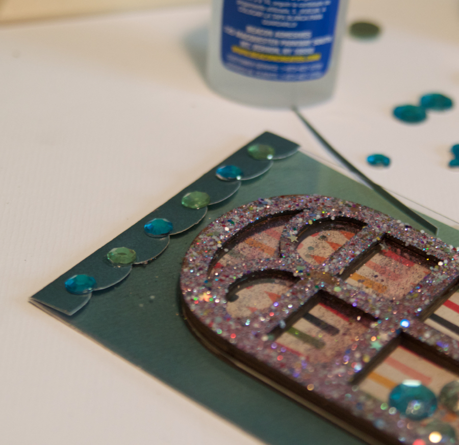 Add the third layer of chipboard to the FACE of the card, then add sequins and or glitter, or as I did BOTH!