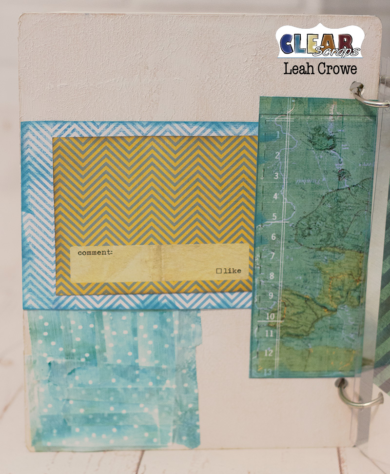 I took two 12×12 acrylic sheets and cut them down to 6 1/4 x 7 1/2 and added two pages to this album. On this first page, I placed the anchor from the helm & anchor chipboard embellishment. The acrylic is so crystal clear, you can see everything that isn't covered.