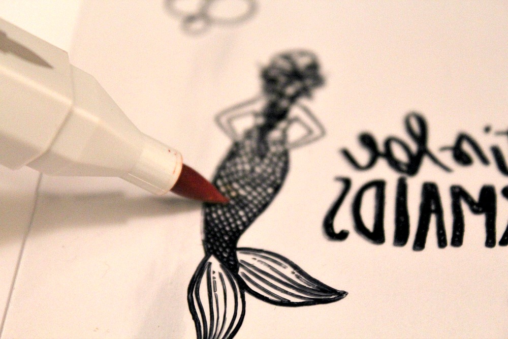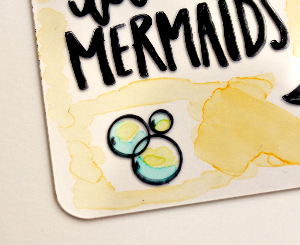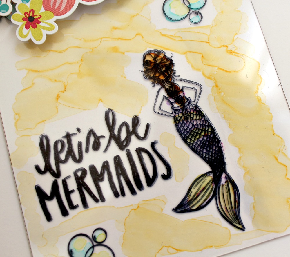 Next, you will FLIP your tag over and remove the second sheet of protective film. We are coloring on the opposite side of stamping because we do not want our mediums to intermix. I used alcohol ink markers from Spectrum Noir to color in the mermaid's tail and hair. I also used the yellow marker to fill in background color.