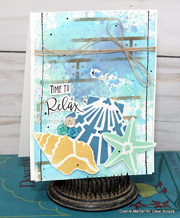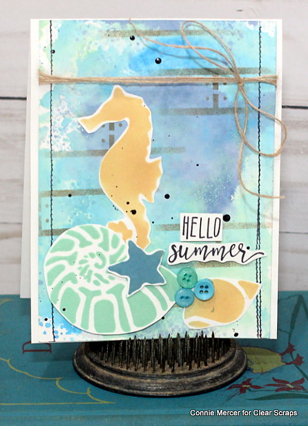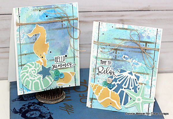 Hi, Connie here with two cards using 6" stencils by Clear Scraps. Using stencils is an easy way to make cute and quick cards. The stencils can be used to create the background for the card or they can be used as the focal images on the card. I did both~
