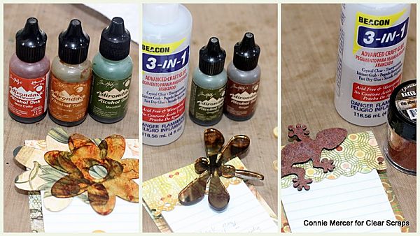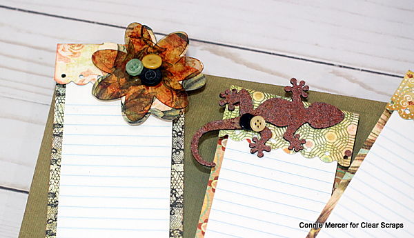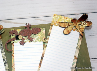 The acrylic flower is colored with alcohol inks. The mirror dragonfly is colored with alcohol inks. The chipboard lizard is colored with embossing powder. All embellishments are glued to the top of the notepads with Beacon 3-IN-1 all purpose glue.