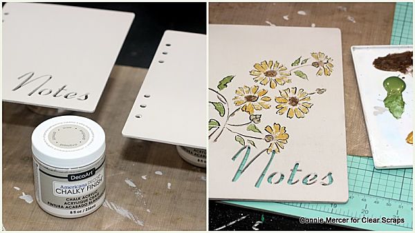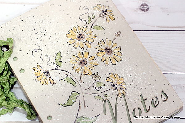 - Stencil the front of the album using the 6" Bouquet Daisies flower stencil by Clear Scraps.
