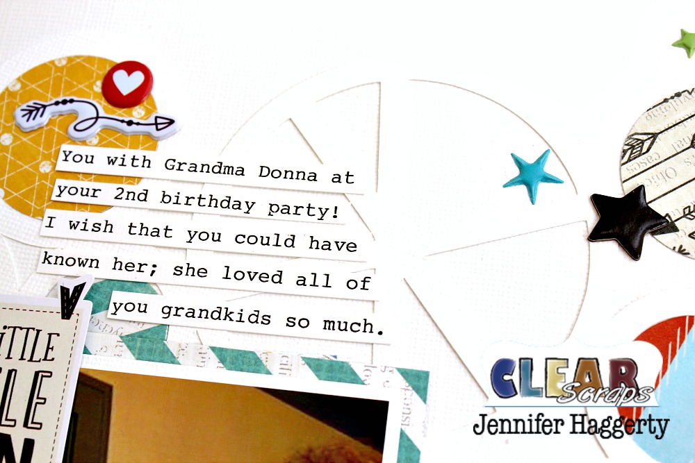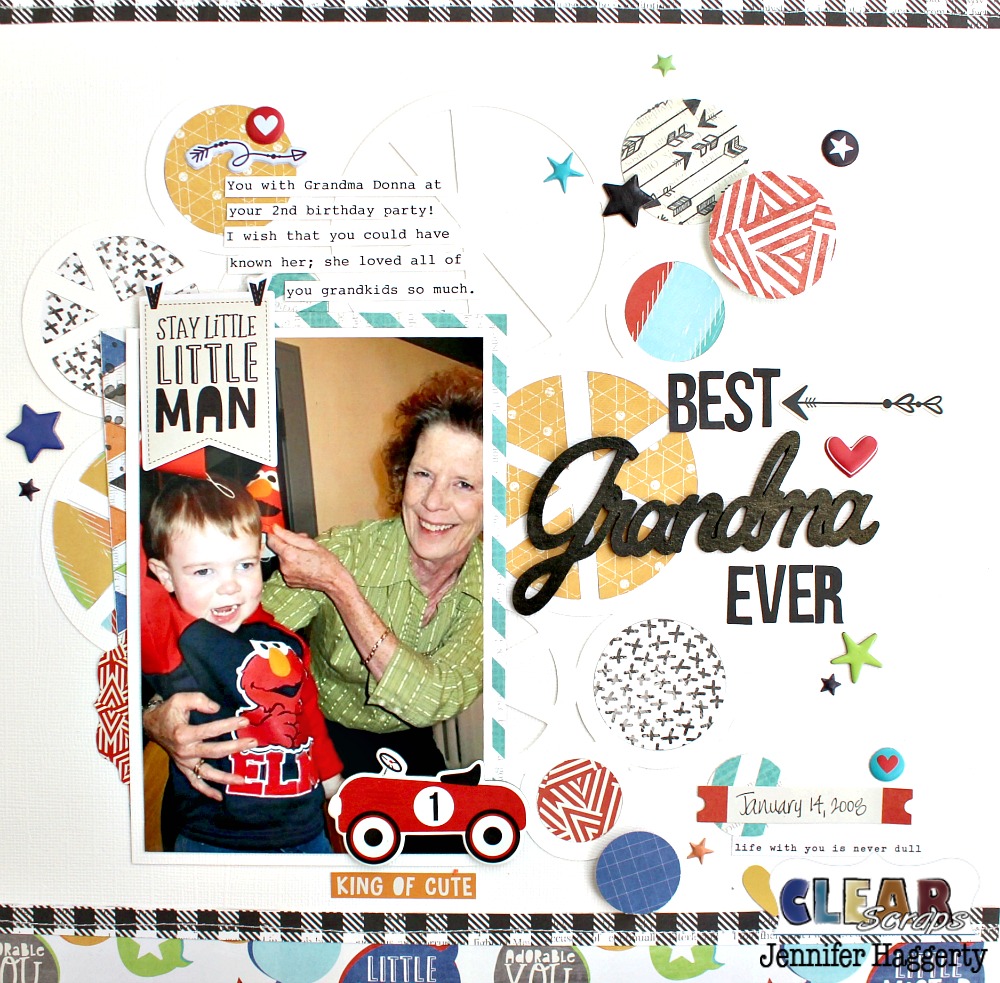 Hello Clear Scraps friends! It's Jennifer on the blog to share a layout I created using one of the many Chipboard Word Titles! I love that Clear Scraps offers so many titles plus embellishment shapes to make your project just perfect! This month we celebrate Grandparents Day here in the US, so I wanted to use the Grandma Chipboard Word Title. I love this photo of my son and my mom from Noah's 2nd birthday.
